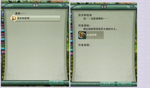 上交任务后等待【莫老】对话,对话完后边上的【苏大娘】会有黄色卷轴,接取[念女如在兹]任务,去七秀坊寻找【莫夏】。