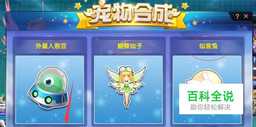 在宠物合成界面,可以进行三种宠物的合成,分别为:外星人憨豆、蝴蝶仙子以及仙宫兔。选择图中任意宠物,点击下方的“合成”。