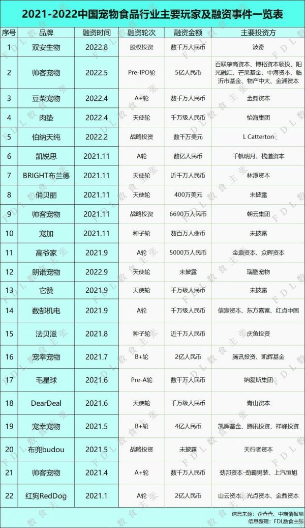 作为宠物行业收益最大的子行业,宠物食品拥有最稳定,消费频次最高的市场需求,因此也备受资本关注,成为当之无愧的吸金大户。近两年来,我国宠物食品行业融资频发,据数食主张不完全统计,2021-2022年9月,宠物食品赛道融资事件已达22起,总金额超10亿元人民币。