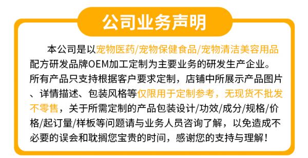 {宠物犬猫食品、宠物医药品、宠物营养补充剂、宠物保健品、宠物品牌、宠物沐浴清洁美容用品、宠物除臭消毒品、宠物外用护理品、宠物皮肤毛发护理用品、狗狗猫咪驱虫药品产品、宠物口腔清洁护理用品、犬猫眼部清洁护理用品、宠物耳部清洁护理用品、宠物鼻部清洁护理用品、宠物足部清洁护理用品、宠物创伤护理药品、宠物行为矫正用品、宠物日常营养保健品、宠物营养膏、宠物鱼油、宠物维生素、宠物矿物质微量元素、宠物氨基酸、宠物牛磺酸、宠物益生菌、宠物肠胃保健品、宠物鲨鱼软骨素、宠物关节营养品、宠物钙剂、犬猫美毛营养品、犬猫爆毛粉、猫咪化毛保健品、宠物免疫调节营养品、宠物高免因子、宠物用牛羊初乳、宠物免疫球蛋白、宠物乳铁蛋白、宠物辅酶Q10、犬猫养心营养品、宠物泌尿通、宠物蔓越莓、宠物补血肝精、宠物发育宝、猫鼻支滴剂、宠物巧克力膏、宠物禁情片、宠物发情粉,OEM贴牌、OEM代加工贴牌、OEM贴牌定制、宠物产品定制加工、OEM加工定制、宠物营养补充剂OEM贴牌代加工、宠物保健品贴牌加工、犬猫营养品定制代工、宠物用品OEM加工贴牌、宠物药品代加工生产、宠物营养食品OEM定制生产}