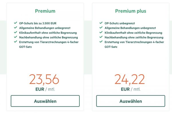 小编这里假设,我养了一只3个月大的英短,家养,每个月的保费是24欧,而且现在Premium和plus没有什么差异,直接选Premium plus, 手术无上限全包~