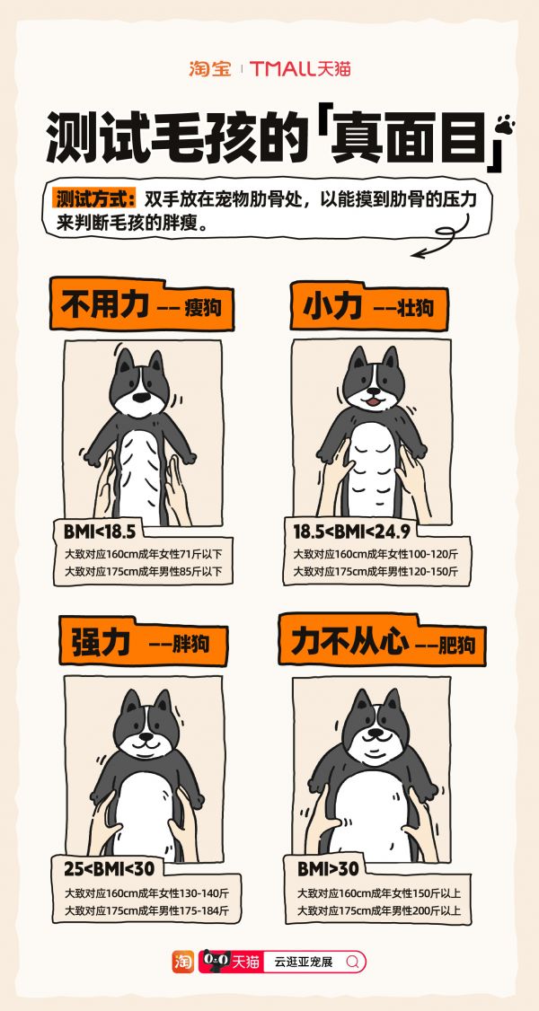 最近看到淘宝天猫发布的一张宠物BMI自测图,用可爱简单的方式来教我们自测宠物是否超重。圆滚滚的小猫小狗固然无比可爱,但体重超重对于宠物健康的危害严重...